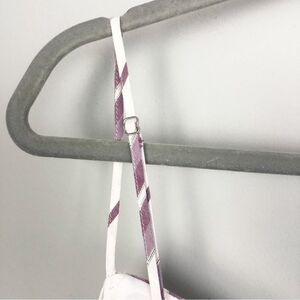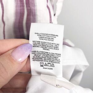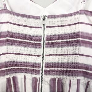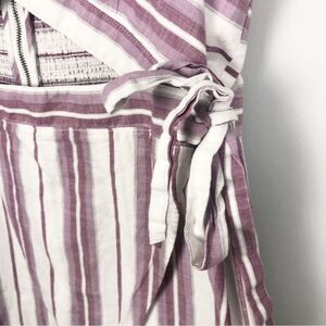 Super cute purple and white striped dress by Express. Triangle under bust cutout. Sleeveless with thin adjustable straps. V-neck. Wrap look skirt with tie. Smocked back with zipper closure. Great preowned condition. Womens plus size 18.