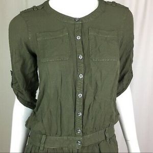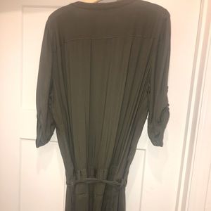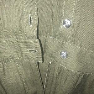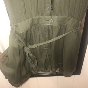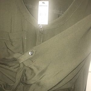 This olive/army green EXPRESS romper is waiting for you! It is new with tags. It features a button top with 3/4 sleeves and hemmed bottom with sipper closure. It also has a belt to tighten the romper at your waist.