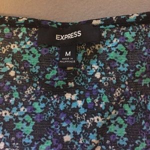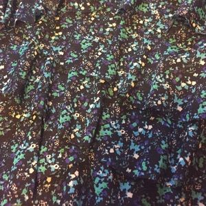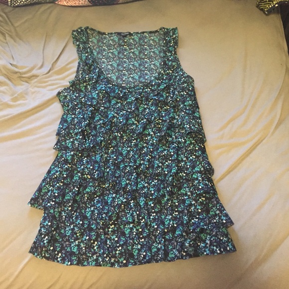 cute ruffle tank top with green, turquoise, purple, black and white small dot ish pattern. u shaped neck and neck high back. ruffles only go half way around so there are none on the back