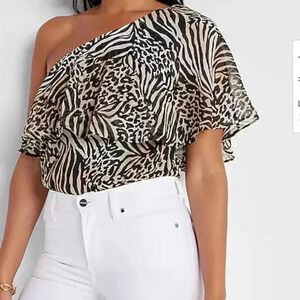 Rachel Zoe X Express animal print draped one shoulder bodysuit with bottom snap closure.