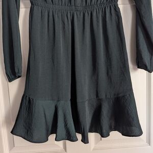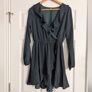A flattering forest green wrap dress from Express featuring soft ruffle trim and an adjustable tie waist. The rich color and feminine silhouette make it perfect for dinners, parties, or seasonal events.