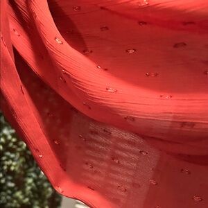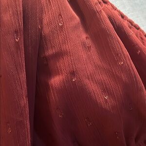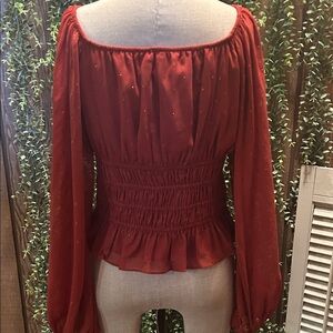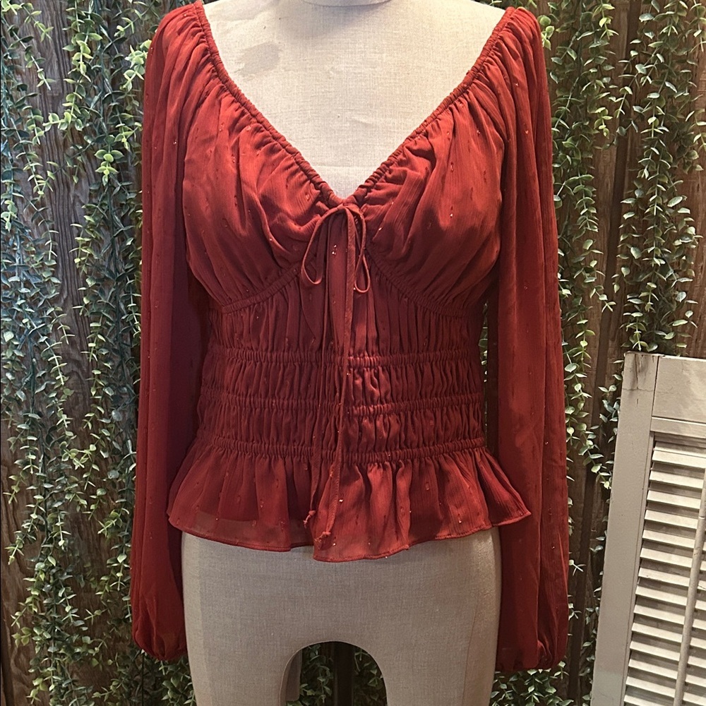 This elegant rust ruched top features a flattering fit with long sheer balloon sleeves and embellished pattern. V-neck with tie front. Lined front. Medium. Worn once. EUC. Smoke-free home.