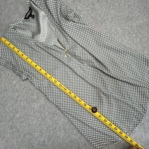 EXPRESS satiny tunic blouse in a bluish gray with white polka dots. Features a functional 1/4 zip V-neck, rolled cap sleeves, and tunic length silhouette. Made of a soft, stretchy polyester spandex blend. In excellent preowned condition.