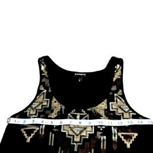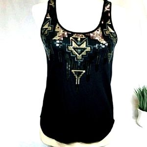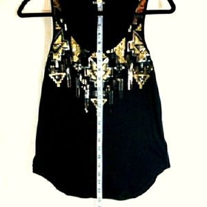 This black tank top has a deep scoop neckline and a modified racer back style. It features a sequined design on the chest area, and is great for casual daily wear, or a night out.
