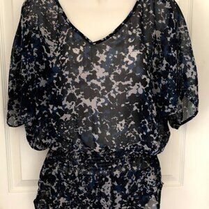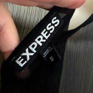 EXPRESS Set of Two Women's Chiffon-Like Lightweight Tunics Size Small Super Stylish! Tops are pre-owned in very good condition. There is an elastic waist - both are identical style tops just differ in color. One is a solid black and the other has a spot print. Both are kind of see through. Approximately 29 inches long.