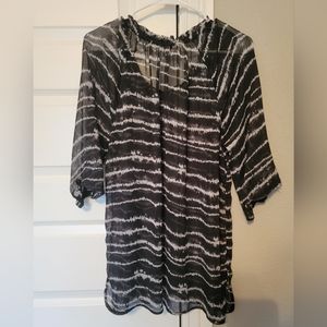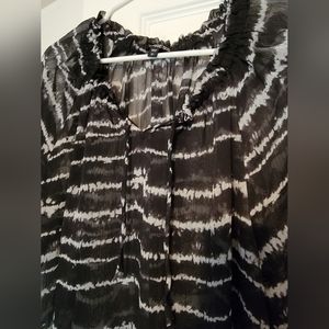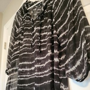 This flowy shear top from EXPRESS is a women's size L. It's black with an abstract white stripe design; also with slits on the side and a tie around the neckline. It's very lightweight and comfortable.