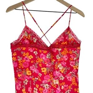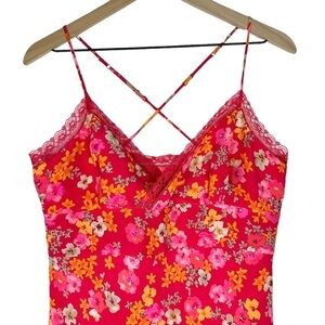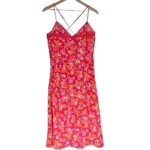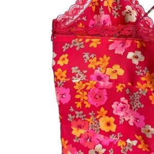 Dress is in good pre-owned condition. Super soft, slinky fabric. Bright pink & orange floral print. Lace surplice neckline. Adjustable straps. Side zipper with hook & eye closure. Perfect for summer! Please see photos for details.