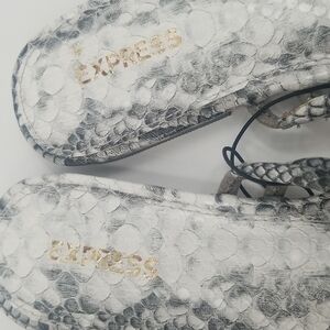 Express Snakeskin Mule Open Sandals. White with Black & Gray Tones, Two Double Straps, Slip On, Flats. Comfy. Enhances Dresses, Skirts, Slacks, Jean Outfits, Chic Classic! B29.