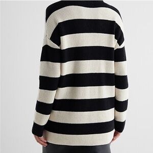 This is an oversized tunic knit sweater with black and cream (not a bright white) striped sweater with very cute gold zipper detailing.