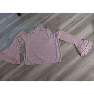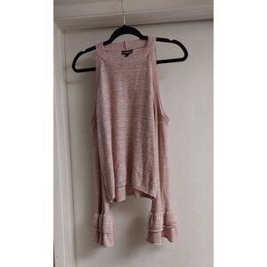 This sweater by Express has been worn twice and is in excellent used condition. Done in a light peach color, it has cold shoulder styling and double ruffled long sleeves. It is size Medium, measures 24" in length and 16" across from armpit to armpit when laid flat.