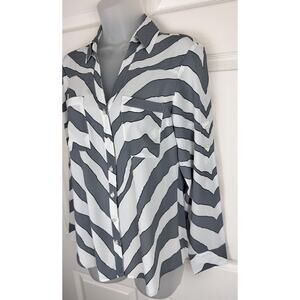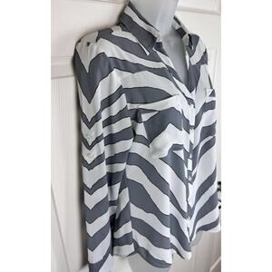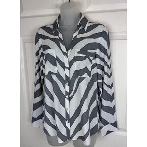 Add a pop of pattern to your wardrobe with this Express Portofino Shirt featuring a zebra print in shades of gray, ivory, and black. The roll tab sleeves and V-neckline add a touch of sophistication to this basic style. Perfect for any occasion, from travel to party or casual wear.