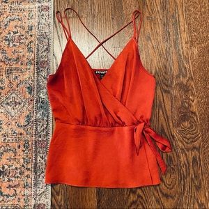 Express red satin cami. Plunging v neck with hidden clasp for extra coverage. Elastic waist band. Peplum style. Such a beautiful deep red color that looks so good with a red lip! Worn once. Excellent condition! Color best matches modeled photos.