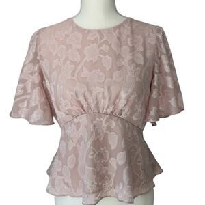 Features: Zipper closure in the back with hook & eye keyhole. Tone on tone floral design. Flutter sleeve.