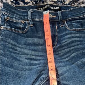 These blue skinny jeans from Express showcase a medium to light wash with subtle color variations for a relaxed vibe. The classic skinny fit offers a flattering silhouette, making them a stylish choice for any occasion.