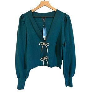 EXPRESS V-Neck Embellished Bow Cardigan This soft-knit cardigan features a plunging V-neckline, long puff sleeves, and a Snap button-up front with two oversized, jeweled bow accents. The sweater is finished with rib knit contrast at the collar, cuffs, and bottom hem.