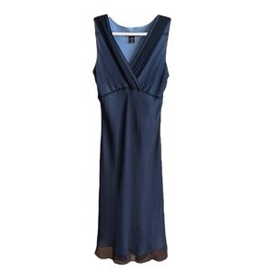 90s Y2K era dark blue silk midi length dress that’s perfect for an evening wedding or night out. It is sleeveless with a surplice V-neckline with knife pleat details, and an empire waist. It has a sheer silk dark blue layer over a light blue opaque lining.
