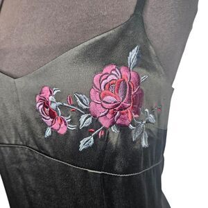 Express vintage satin slip dress. Size 7/8. Spaghetti straps that cross at the upper back. Zipper closure. Embroidered flower on left bust. Body hugging silhouette. Great pre-owned condition!