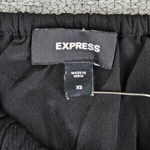 Express women’s black blouse in size X-Small (XS), featuring a romantic square neckline with a center tie detail. Made from 100% polyester, the top includes sheer puff sleeves with elastic cuffs and a fully smocked bodice for a flattering, fitted silhouette. Slightly ruffled hem adds a feminine finish. Lightweight and breathable, ideal for layering or standalone wear.