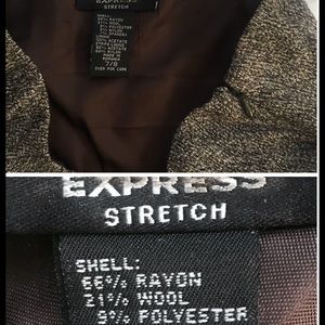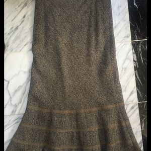 DARK BROWN MIX, LOOKS GREAT WITH CABLE SWEATERS , CHAMBRAY SHIRT, ETC. WOOL BLEND , NOT ITCHY, WITH FOUR LAYERS OF LACE AND INCLUDING HEMLINE, UNUSUAL STRIPES ON PART OF  LINING NWOT, NEVER WORN