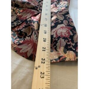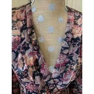 The EXPRESS Women Metallic Whimsigoth Top Blouse is a stylish and unique piece perfect for those who love dark and whimsical designs. This faux wrap blouse features a beautiful floral pattern, long sleeves, and a V-neckline. The metallic material gives it a touch of elegance, while the ruffle accents add a playful detail. Ideal for a party, cocktail event, or business setting, this blouse exudes a fairy character with a hint of gothic and vamp themes, making it a versatile and eye-catching addition to any wardrobe.