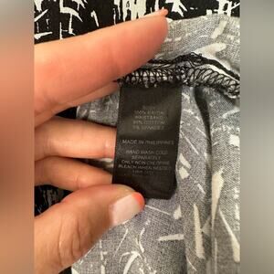 Features 3/4 sleeves, ribbed waistband, geometric line print throughout, button closure keyhole back and lightweight fabric construction.
