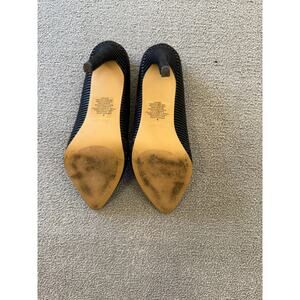 A pair of Express black high‑heel pumps in velvety texture with tonal stripe detailing, pointed toes, and stiletto heels—ideal for sleek, elevated looks. Subtle wear on the soles suggests light prior use.