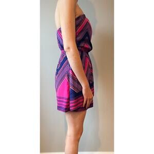 The EXPRESS Women's Summer Purple & Pink Boho Mini Dress in size XS is a stylish and versatile piece perfect for various occasions. This sleeveless dress features a geometric pattern, a pullover closure, and a strapless design, making it ideal for travel, weddings, parties, casual outings, or formal events. Made from a blend of polyester and spandex, this lightweight and stretchy dress is machine washable and easy to care for. The purple color, bohemian theme, and mini length add a touch of sexy and playful flair to your summer or spring wardrobe. I have also used this as a bathing suit cover up.
