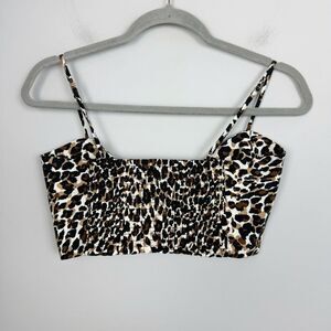 Adorable animal print crop top by Express and Rocky Barnes. Linen blend. Bow front. Smocked back. Thin adjustable straps. Adorable black, tan, and brown leopard print. Pair it with some matching shorts or solid color pants. Easy to dress up or down. Great for a night out! Like new condition. Women’s size small.