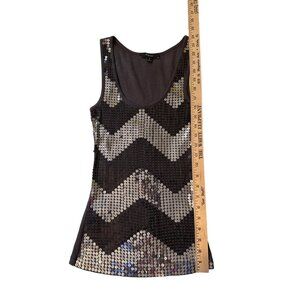 Express grey zig zag sequin tank top. This chic top is perfect for adding a dash of glamour to your everyday attire. Its sequin detailing and zig zag design is sure to turn heads wherever you go.