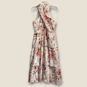 EXPRESS linen halter midi dress cream pink romantic crossover sexy tiered medium