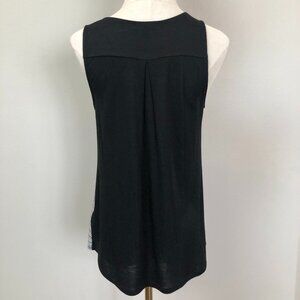 This is an EXPRESS small tank top with black, gray, and white stripes with the back solid black.