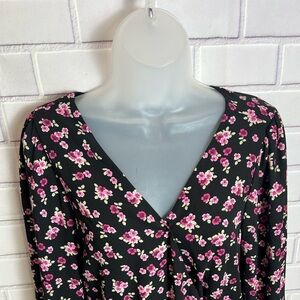 Chic black romper with pink floral pattern. Features a flattering V-neck and long sleeves.