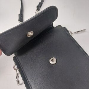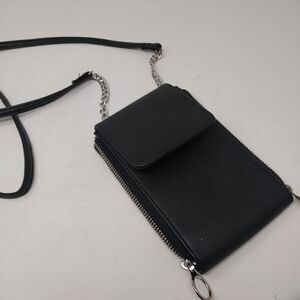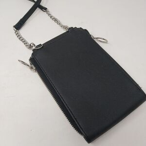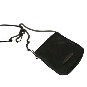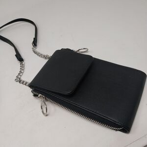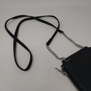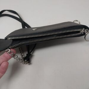Dark charcoal grey. Approximate measurements are approximately 6" x 5.5". Chain strap that is approximately 50". Very good condition. Snaps closed.