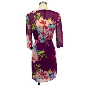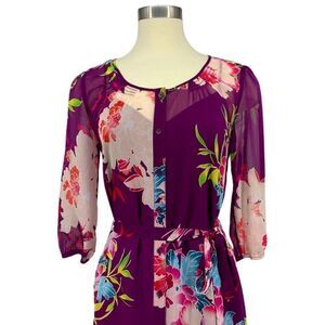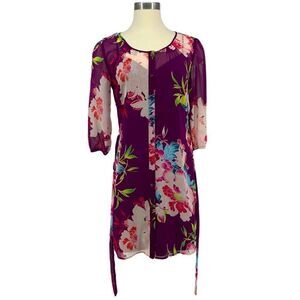 Sheer button-down shell, plum slip, and a tie waist belt. The slip’s spaghetti straps are attached to the outer shell by a sewn string inside the shoulder. Waist tie belt. 3/4 length sleeves. Plum base with gorgeous multi-color tropical flowers. Exotic look! Pairs best with flip flops. Super chic with a bun or bob cut. Versatile dress can be dressed up or down. Discontinued style. Smoke-free and pet-free home.