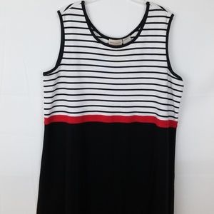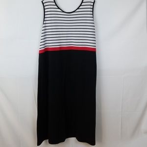 EXPRESSION PLUS DRESS 49IN LONG, CHEST 24 1/2 IN, HIPS 28IN, HEM OPENING 35IN, BLACK BOTTOM, BLACK AND WHITE STRIPE CHEST, RED BAND AT WAIST.
