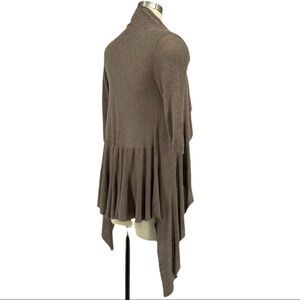 RARE GEM! Long sleeve waterfall cardigan in heather mocha. Shawl collar. Sheer and thin material (high quality). Cardigan is not see-through, but there are see-through lines sporadically placed throughout the design. Flowy silhouette especially in the back, where the material has a tulip-like spin to it. 3/4 length sleeves sleeves with ribbed edges for added dimension. Discontinued style. Smoke-free and pet-fee home.