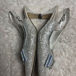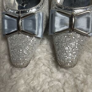 EY Boutique silver glitter &patent silver trim 3”heels satin gray bow accentSZ12