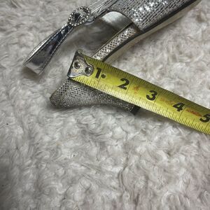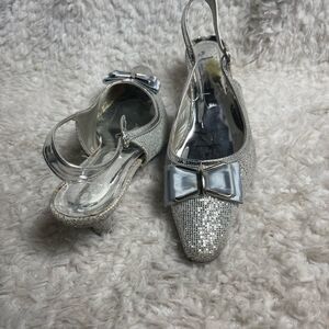 EY Boutique silver glitter &patent silver trim 3”heels satin gray bow accentSZ12.Pre owned in good used condition signs of wear on the inner and outer soles.See all pictures any questions please message.