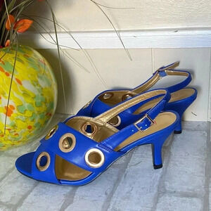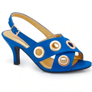 Metallic grommet accents on smooth faux leather make these stylish strappy sandals truly runway ready.