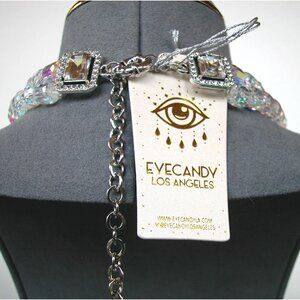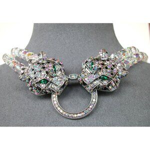 This statement necklace by Eve Candy Los Angeles showcases two intricately designed panthers adorned with crystals and green eyes. The shimmering crystal strands add elegance, making it a striking accessory for formal occasions.