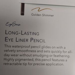 Long lasting eye liner pencil in Golden Shimmer. Waterproof, glides on smoothly. All day wear without smudging. Retractable tip.