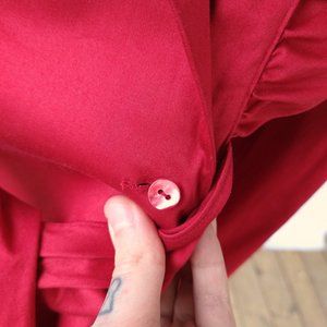 really beautiful with a very flattering fit! features natural mother of pearl buttons and front tie to tighten waist. good preowned condition - small pinhole in collar + small dark smudges to one sleeve cuff (last 2 photos)