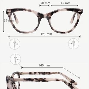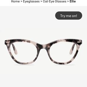 "Ellie" frames from Eyebuy Direct. Mottled grey, cat-eye frames. Size small, 49-20-140 dimensions. Will need your script put in. So very cute and in excellent condition!