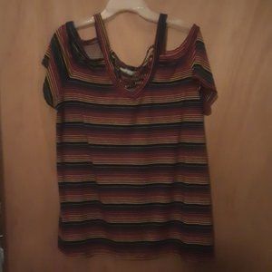dark rainbow vertical stripes , cutout front , in decent Pre-owned condition with no holes or stains. size 3X. measurements are roughly 28" from shoulder to hem and 24" pit to pit. pet friendly non smoking home