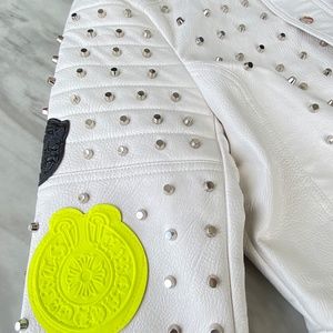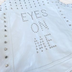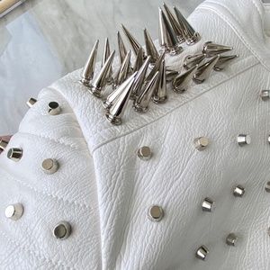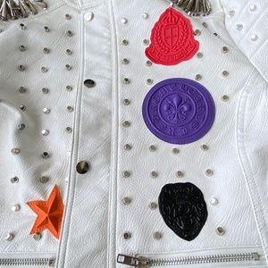EYES ON ME faux leather jacket in White with studded detail, shoulder spike and bright multi-color patches.The ultimate standout statement jacket! Zipper front closure with snaps.