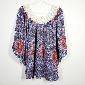 Crochet neckline, floral design, drop shoulder, elbow sleeve, pop-over top.