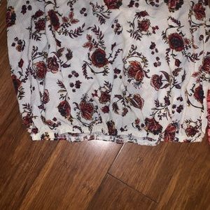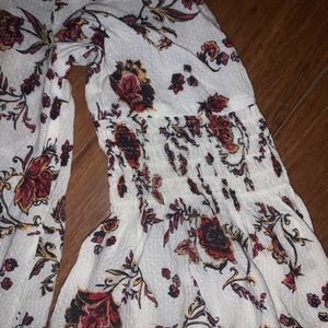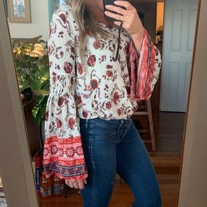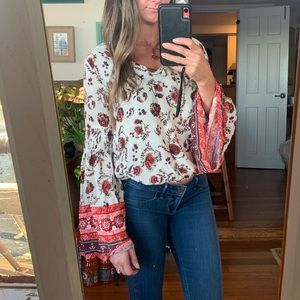 Flared sleeves, with mid-arm cinching. V-neck. Tight around bottom for a lose flowy style. Wicked comfortable.