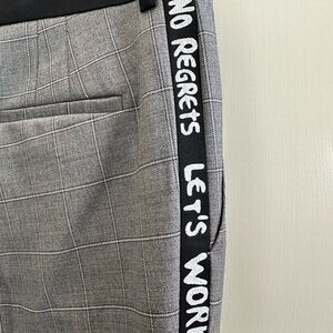 Each Other funky gray dress pants with writing down the side of the legs in size large. Great condition. The rise is 11 inches. The length is 39 inches. The waist is 30 inches.
