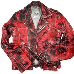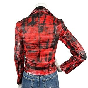 This striking leather jacket from Each x Other is part of a limited artist collaboration with Daniele Innamorato, known for bold, expressive abstract art. Crafted from buttery-soft 100% lambskin leather, the piece features hand-painted red and black brushstrokes, giving it a wearable gallery vibe.