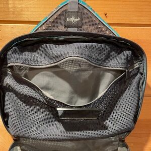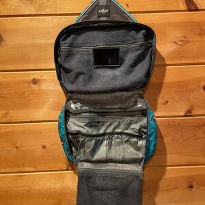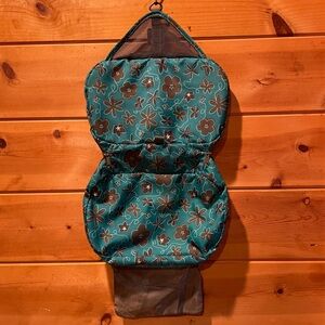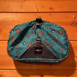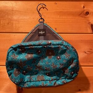 Eagle Creek Travel Bag perfect for any getaway. Featuring a teal with black floral design. Two large compartments for loose items. Six individual pockets to store and organize daily items like your toothbrush. One smaller pocket that can detach for the security line check of liquids.